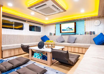 The boat is custom built for SCUBA diving and is equipped with all safety equipment as per international standards. It offers a comfortable and luxurious design that includes an air conditioned lounge, two sun decks, and a large dining area.